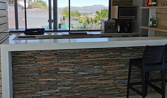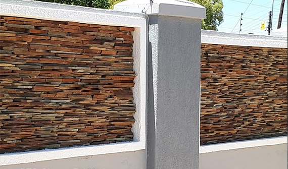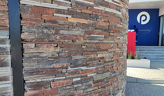 Rockface range is a collection of satin finish, slate-effect floor tiles with a slight riven surface. It has different thicknesses and sizes with a rough edge. Cladding should be done to a rough wall with steel wire or mesh attached to the wall to strengthern the grip of the tile to the adhesive which is also mixed with bonding liquid e.g keycote bonding.